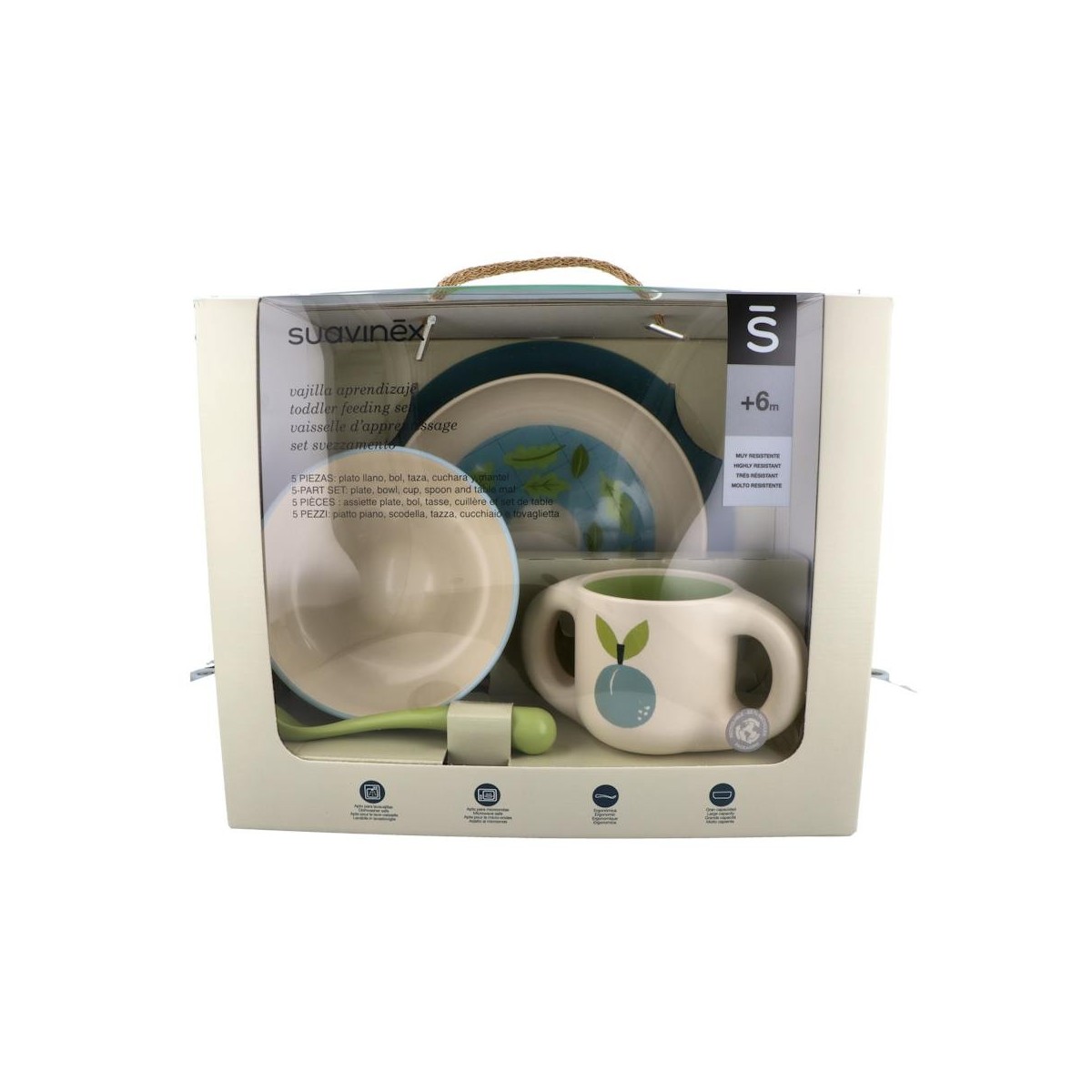 Hecho con materiales seguros y duraderos, el conjunto de vajilla Suavinex para niños contribuye a la independencia y confianza del niño durante la alimentación.